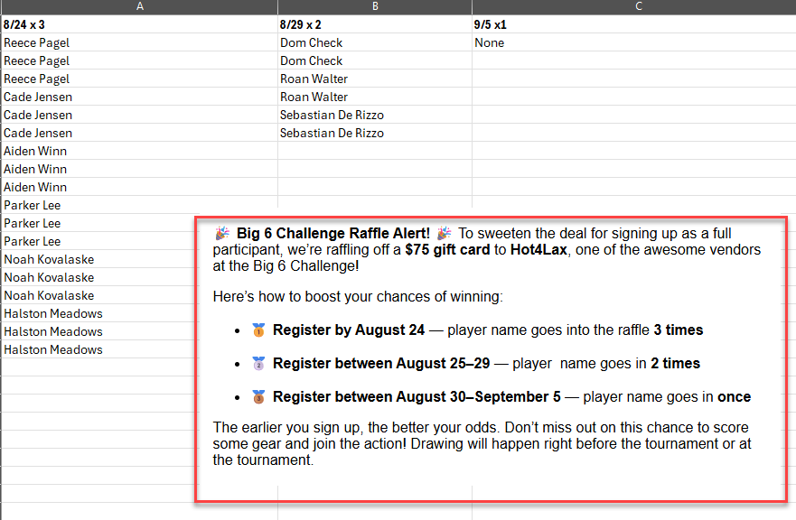At practice on October 7, we’ll be drawing for a $75 gift card to Hot4Lax Lacrosse, who will be a vendor at Big 6. Entry is based on when registration was completed. If you think something different based on your order please let me know. Reminder, this is for the orders in for full participants, both tournaments